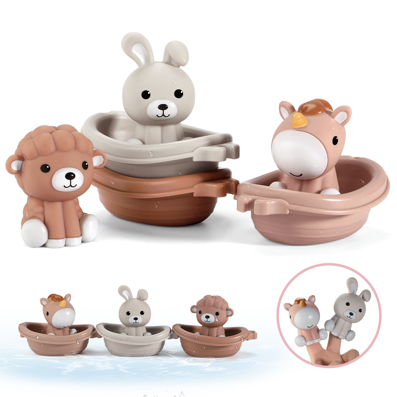 1.Multi-Functional Toys: Includes 3 brightly colored boats and 3 adorable finger puppets, promoting toddlers' color recognition and animal cognition, enhancing their creativity and imagination.