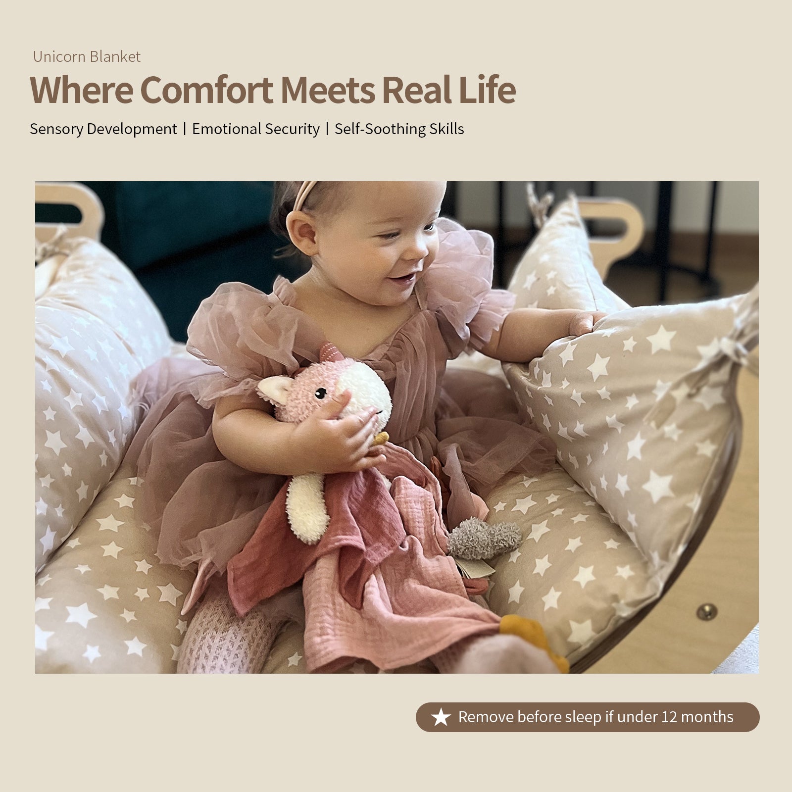 - Safety-First Design for 0-24 Months:"The unicorn security blanket passes rigorous triple testing: OEKO-TEX STANDARD 100 for international ecological standards + US CPSIA + ASTM F963 toy physical safety tests. Strictly monitored from raw materials to finished products - creating a trustworthy exploration companion that puts parents' minds at ease."